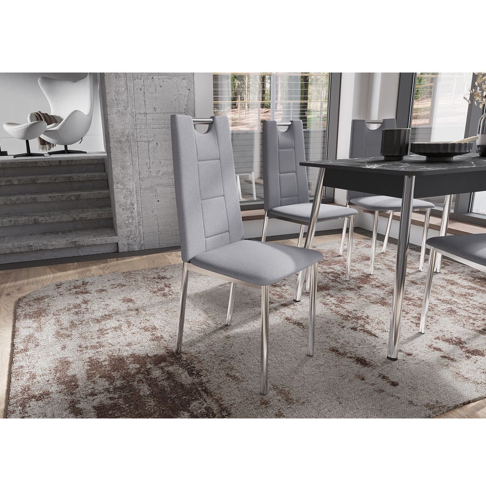 Орлеан - модель стула с удобной высокой спинкой оригинальной формы. Имеет хромированный каркас, мягкие сидушку и спинку, обтянутые рогожкой серого цвета. В комплекте 4 стула.