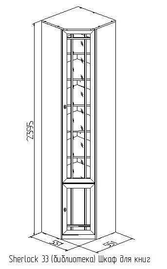 Угловой книжный шкаф - практичное решение для малогабаритных гостиных, библиотек или рабочих кабинетов, где каждый свободный сантиметр важно использовать рационально. Конструкция и габариты шкафа позволят Вам организовать полноценную зону для бережного хранения литературы и сопутствующих вещей. Модуль возможно установить в комнате, высота полотка которой не менее 240 см. Наполнение - комплект регулируемых по высоте полок. Фасад шкафа декорирован тонированным стеклом, свойства которого защитят Ваши книги от вредного воздействия лучей света и загрязнений. Шкаф для книг Sherlock 33 обязательнокрепится к стене за подвесы и межсекционной стяжкой с другими шкафами в комплекте. Особенности ЛДСП 16 мм, кромка ПВХ рамочные фасады из профиля МДФ тонированное стекло 4 мм декор "орех" комплект регулируемых по высоте полок обязательное крепление к стене за подвесы