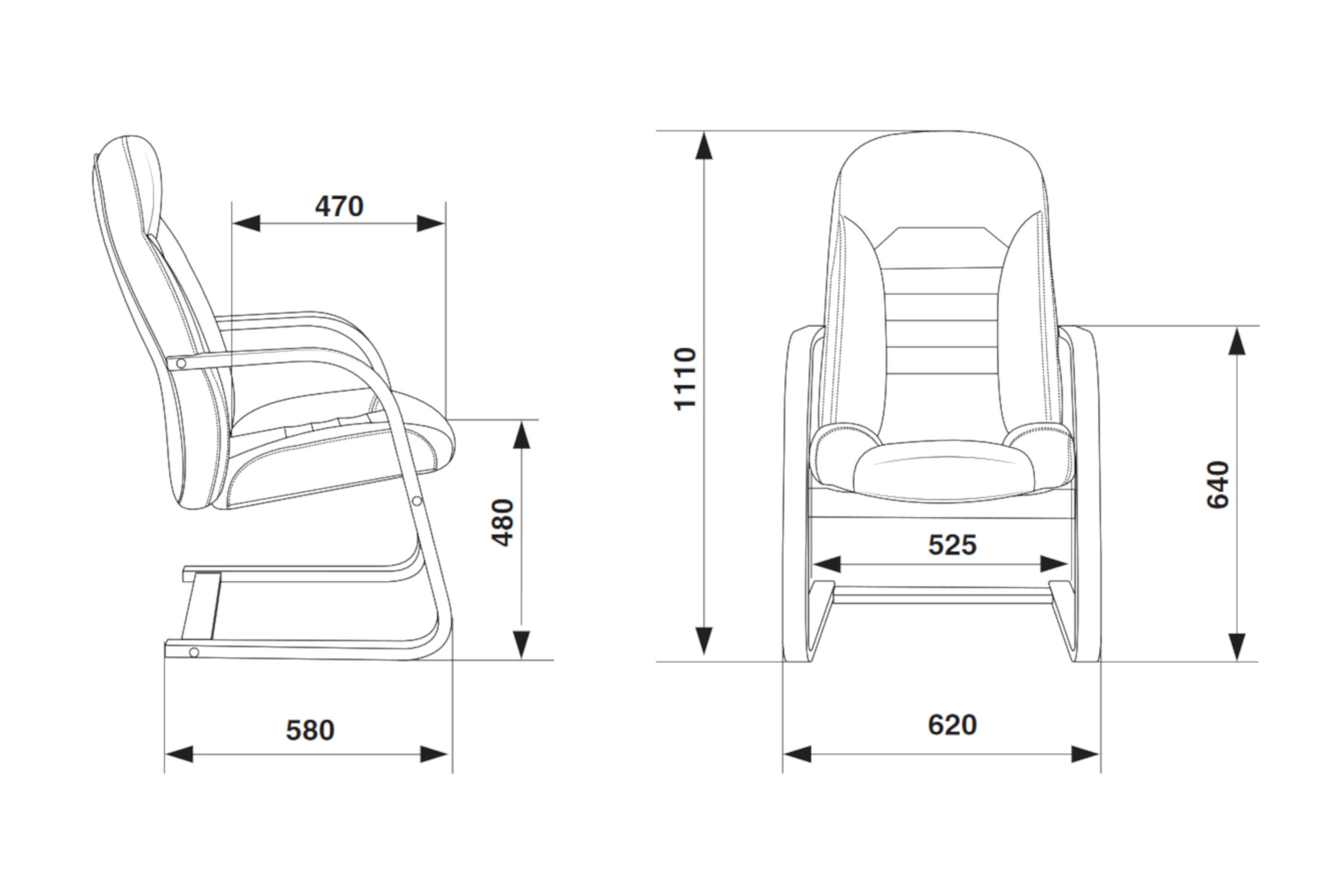 Высота сиденья - 48 см. Высота с подлокотниками - 64 см. Ширина сиденья - 52.5 см. Глубина сиденья - 47 см. Ширина полозьев - 62 см. Материал обивки - натуральная кожа (лицевые части) / искусственная кожа (торцевые и задние части).
